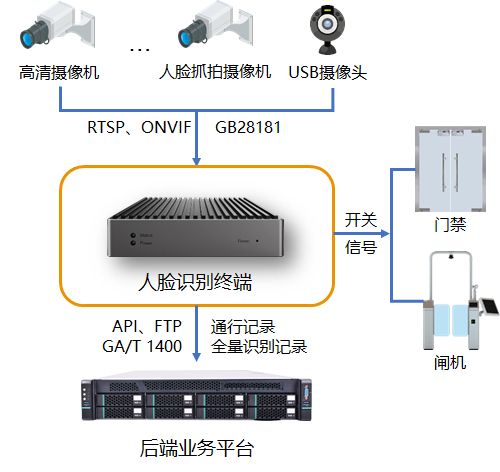 采用人脸识别和访客机的方式,通过门口摄像机采集的人脸信息,跟系统中的人脸库做比对,判断来访者是否有进出权限,并结合传统的门禁识别方式,控制门锁的开关,从而方便人员通行,提高服务质量。业务需要的情况下,可以在人脸识别的同时,记录考勤信息,生成考勤报表。