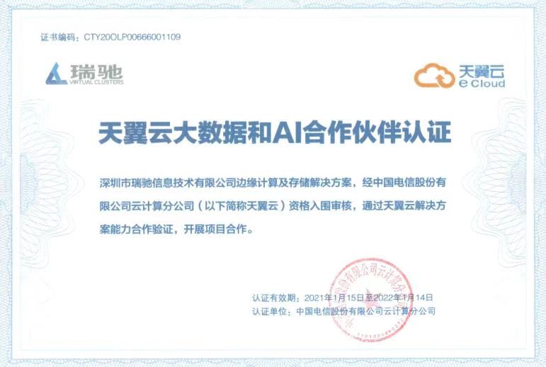 近日,深圳市瑞驰信息技术有限公司荣获天翼云合作伙伴认证,瑞驰边缘计算及存储解决方案,通过天翼云解决方案能力合作验证,成为天翼云大数据和AI重要合作伙伴。
